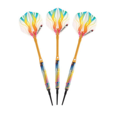 Dazzle your opponent with a vibrant display of skill with the Elkadart Rainbow Soft Tip Darts, designed for use with either electronic dart boards or most sisal dart boards. These darts are packed with features starting with the barrel, fashioned from 90% Tungsten and 10% Nickel. Tungsten is a very dense metal, able to create slimmer darts with the same weight as lighter metals; this allows for tighter shot groupings without sacrificing control, increasing your scores. Tungsten is a sign of quality and durability as well because of its density. A higher tungsten content will produce a slimmer dart profile than one with less. More tungsten in the dart increases the price as tungsten is a rare metal and its density takes more effort to machine. The increased price gives a higher quality barrel and can improve performance, increasing scores. Each titanium coated barrel enjoys deep shark fin ridges, allowing your grip to remain consistent throw after throw. The Rainbow Darts feature tough, 100 micron flights with flashy rainbow graphics. The extra hardiness these flights feature means that you won’t need to replace them as often – they’ll stand up to the toughest throws. Finally, each dart is precision machined for maximum aerodynamics and a sleek, smooth look and features a stylish signature Titanium Rainbow look found in no other dart. Each set includes three 100 micron flights, three golden aluminum shafts, and three 2BA Tufflex II Tips. Made with pride in England.