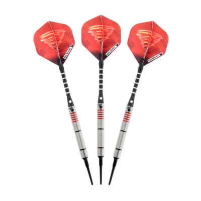 Harness the mighty winds of the furious storm when you bring the Elkadart Tornado Soft Tip Darts, designed for use with either electronic dart boards or most sisal dart boards. These darts are packed with features starting with the barrel, fashioned from 90% Tungsten and 10% Nickel. Tungsten is a very dense metal, able to create slimmer darts with the same weight as lighter metals; this allows for tighter shot groupings without sacrificing control, increasing your scores. Tungsten is a sign of quality and durability as well because of its density. A higher tungsten content will produce a slimmer dart profile than one with less and 90% is among the highest you’ll find in dart set. More tungsten in the dart increases the price as tungsten is a rare metal and its density takes more effort to machine. The increased price gives a higher quality barrel and can improve performance, increasing scores. Each barrel is precision machined for maximum velocity with an aerodynamic design. Featuring recessed rings, this barrel allows your grip to remain precise throw after throw. The Tornado Darts feature tough, lightweight aluminum shafts. These shafts feature locking holes that allow a more secure fit to your barrel; you won’t find yourself retightening these shafts after a shot or two. Finally, each dart is finished off with whirling tornado graphics adorning each flight, for a blustering look on each dart. Each set includes three flights, three shafts, and three 2BA Tufflex II Tips.