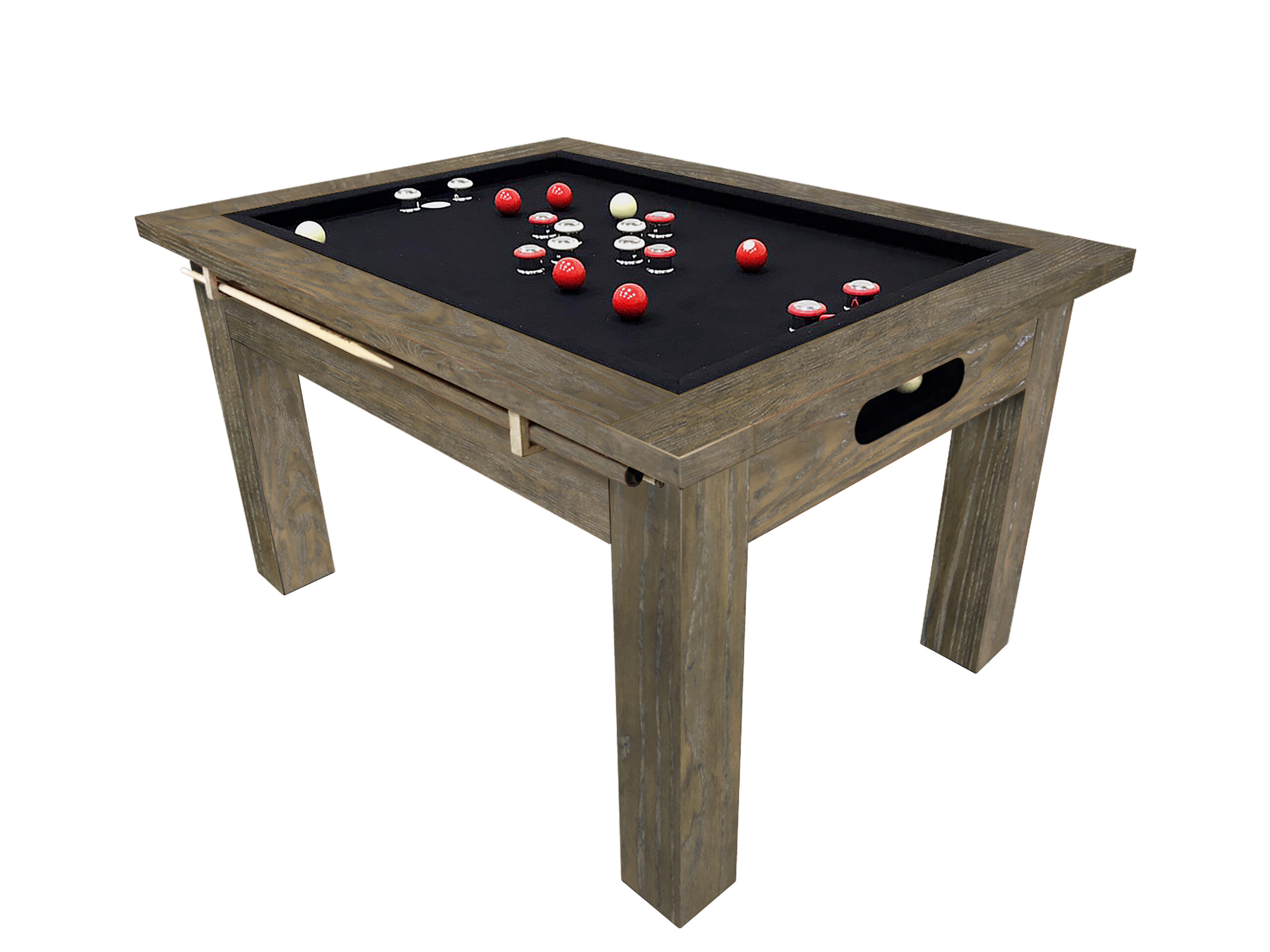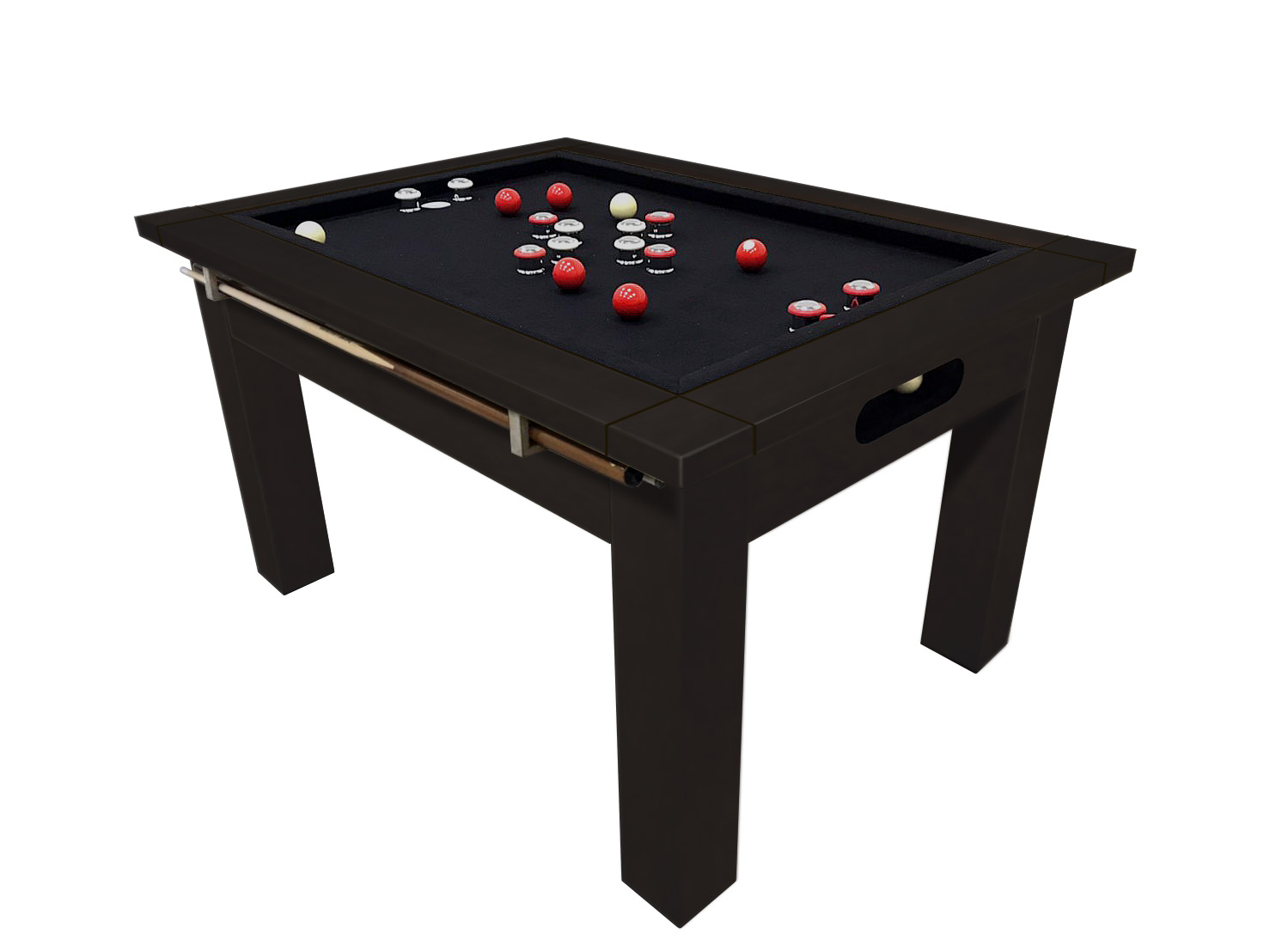 The Baylor bumper pool table will add a modern and inviting style to your game room in a size that fits almost any space. This table brings you the classic game of bumper pool in a contemporary modern style. The quartz playfield ensures a solid level playfield for a lifetime. Available in multiple finishes to match any of our products available in the Legacy Modern Series. The table includes a convenient ball storage box on each end of the table a long with a cue rack on the side. The table comes complete with everything you need to play including balls, chalk and cues. Don’t forget to either get a cover to protect your table or the optional 2-sided dining/game table conversion flip top.