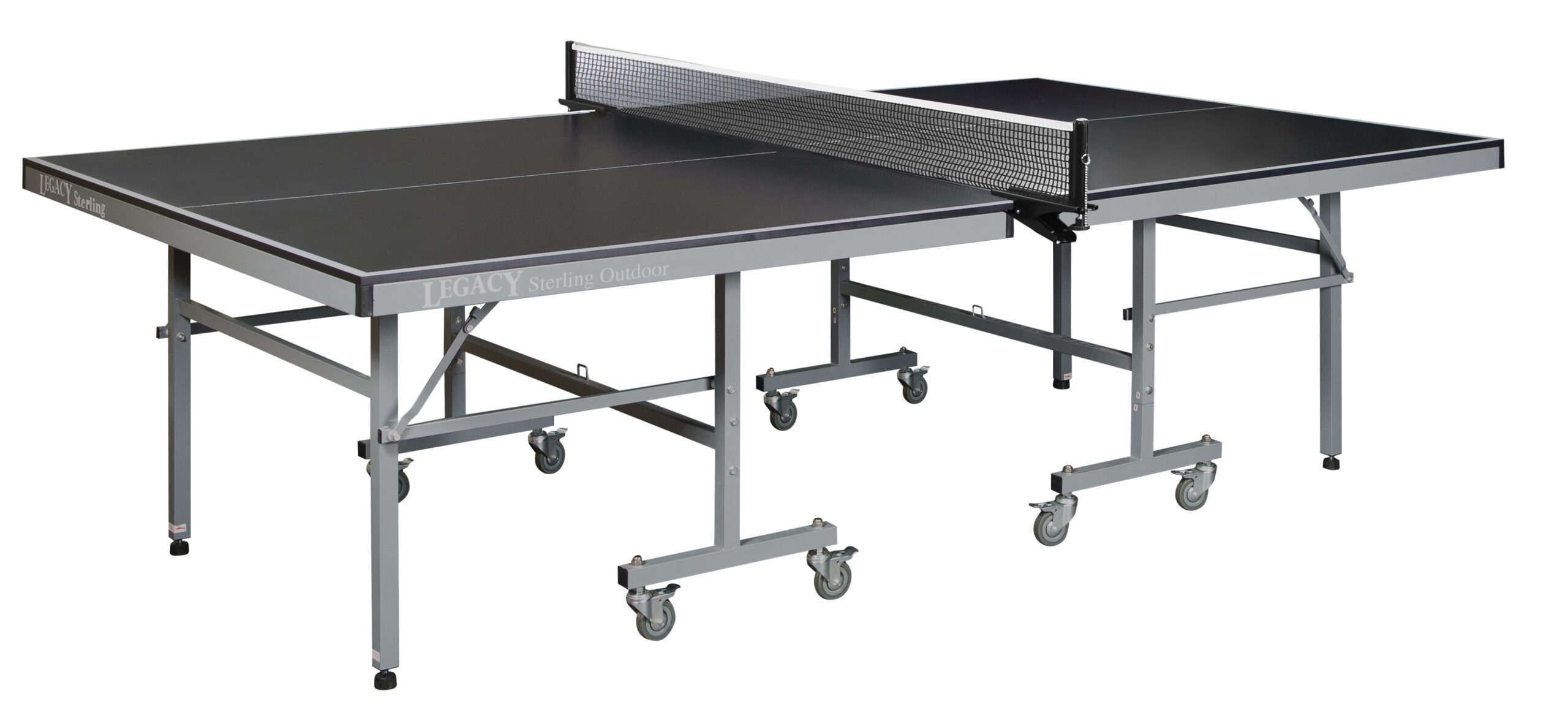 The Sterling Outdoor table is a powder-coated frame, weather resistant table tennis. The play field is 4 mm aluminum plastic board with a black spring clamp and a plastic net to ensure long-lasting play quality on the patio, poolside or in the rec room. Providing portable table tennis fun for everyone, the Sterling Outdoor table folds for up for singles play or compact storage when not in use.
